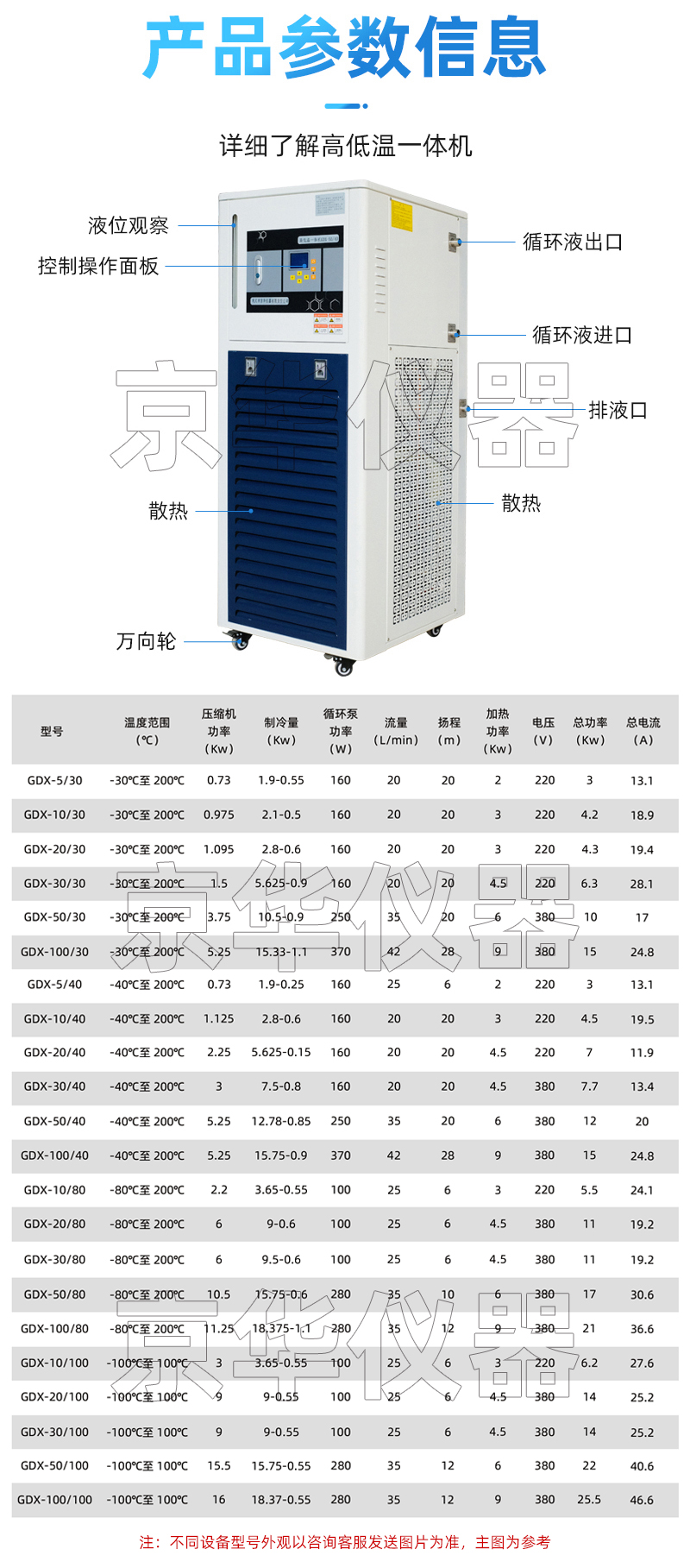高低溫一體機廣泛適用于大專院校、環保、生化、醫療、化工、科研等領域。產品具有結構合理、操作簡便、穩定性能好等特點,是實驗中試的理想設備。隔離式電器控制箱,延長電器使用年限,管路防爆裝置,內置**保護低噪音,耐高溫防腐防銹,獨特的加熱設計,省電耐用適合不同溫控場所使用。