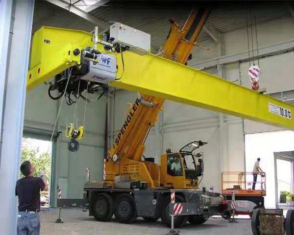 5、雙梁橋式起重機一般由機械、電氣和金屬結構三大部分組成。雙梁橋式起重機外形象一個兩端支承在平行的兩條架空軌道上平移運行的單跨平板橋。